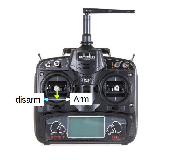 - throttle 최하단, rudder 최우측으로 한 후, 5초정도 지나면 시동(Arming)이 걸립니다. (이 시간동안 자이로와 기압계를 재초기화시킵니다.) 참고로 15초 이상 스틱을 이 상태로 고정하고 있으면 Auto Trim 모드로 들어가게 되므로 주의하세요.