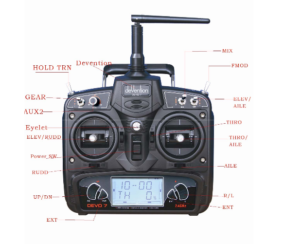 조종기 : 모드1(좌측 스틱이 가운데 고정된 모드), 모드2(우측 스틱이 가운데 고정된 모드) 아래 그림은 모드2(조정기 우측 스틱 가운데고정)