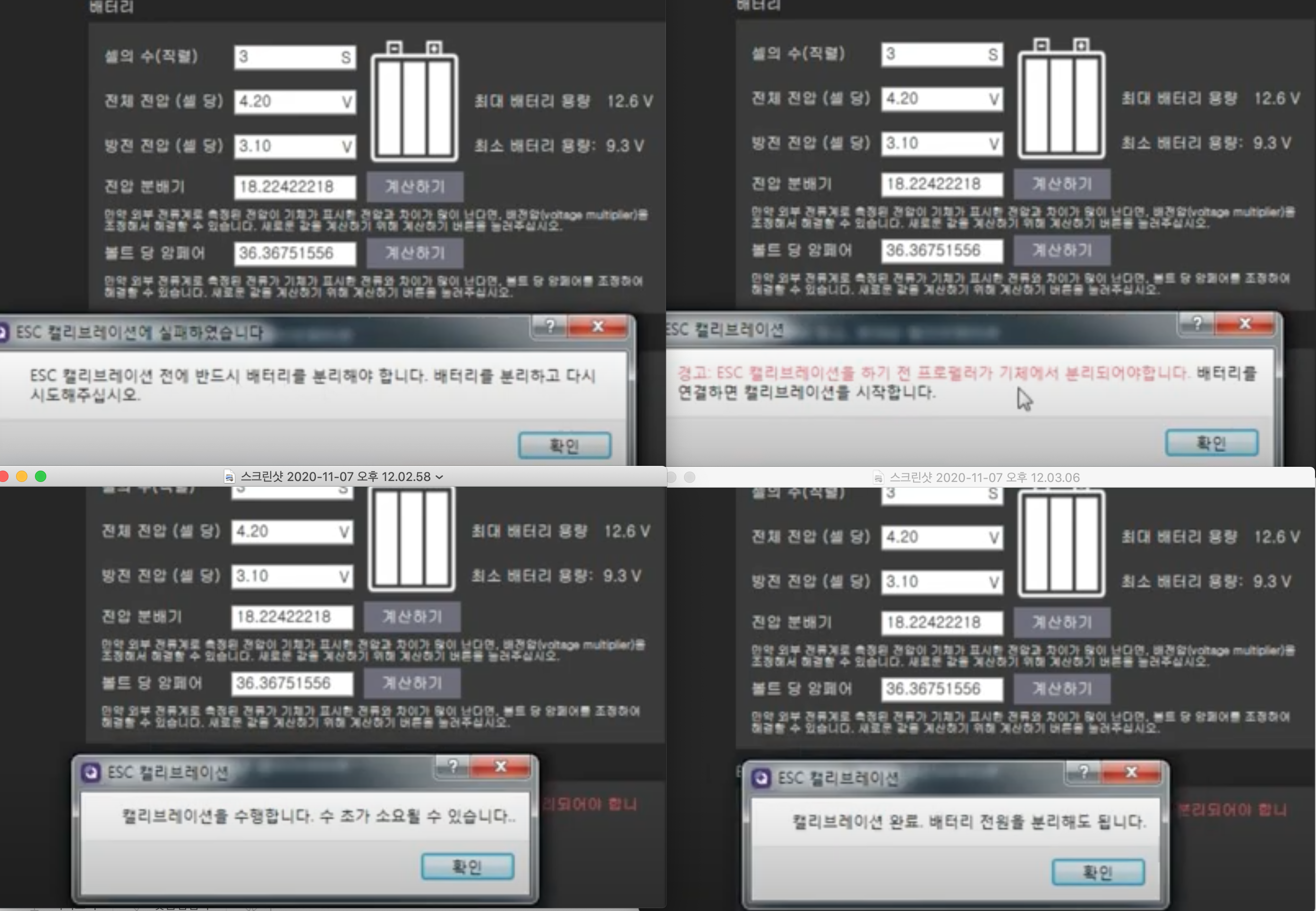 부팅후 배터리 전압 -> 리포알람으로 체크 -> 수치확인(ex. 11.9) -> 1.측정배터리전압값 : 11.9로 수정후 엔터 -> 비행데이터 하단에 변경된 수치로 나옴