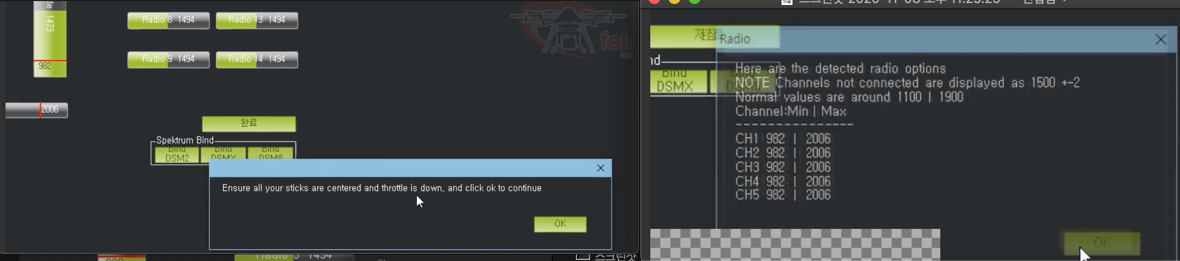 스위치 가운데 위치, 스틱 모두 가운데 위치하고 "완료" 클릭시 팝업 "스로틀을 아래로 내림" -> OK -> 설정값 나오고 OK 클릭하면 완료